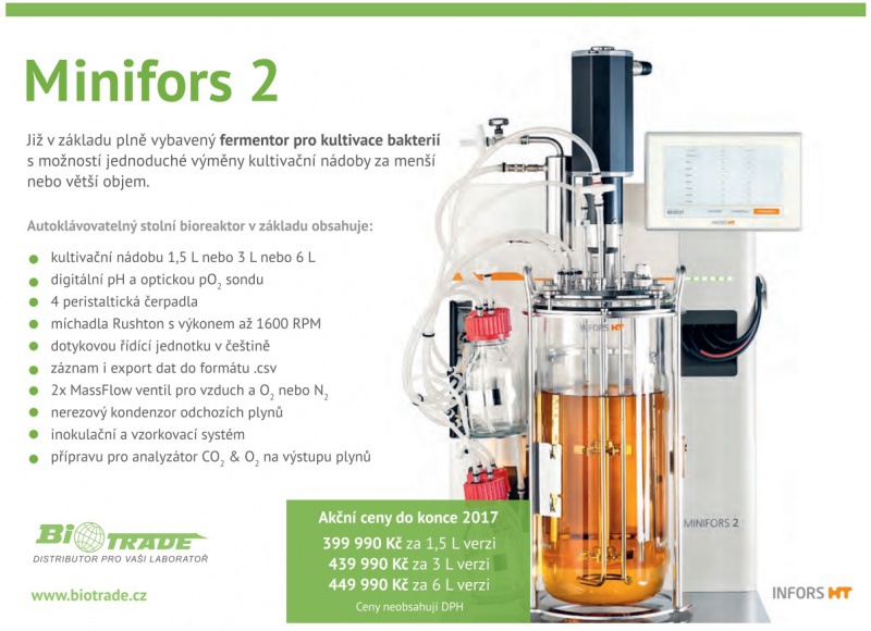 Minifors 2 navíc letos získal prestižní ocenění iF za design, což podpírá tvrzení, že tento laboratorní přístroj si budete chtít v laboratoři vystavit na viditelné místo. Abychom Vám rozhodování usnadnili, připravili jsme ve spolupráci s firmou INFORS HT akční nabídku s platností na všechny objednávky došlé do 31.12.2017: